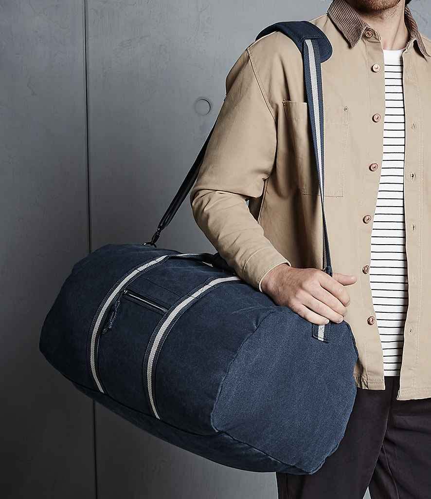 Holdall comes with a Padded hand grip, Detachable adjustable shoulder strap with pad. Two tone webbing details. Vintage brown has solid webbing details. Antique brass effect fittings. Internal valuables pocket. Front zip pocket. Padded base. Capacity 45 litres.