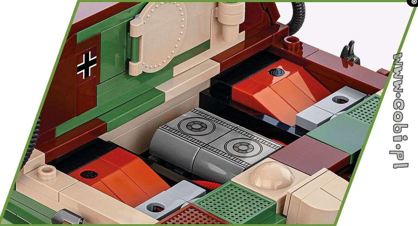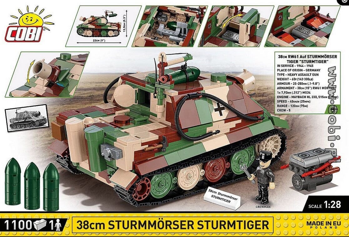 The COBI 1:28 scale Sturmtiger brick model kit is historically accurate and comprises 1100 elements to reflect the vehicle's intricate details. Measuring 23cm in length, it features durable prints depicting authentic markings and characteristics. Interior elements and a removable brick engine add realism, while movable mortar barrel and wheels enhance playability. The set includes four mortar shells and a crane for missile handling, alongside a new element accurately representing the Sturmtiger barrel. Completing the set is a mechanic figure, making this detailed model a prized possession for collectors and military history enthusiasts.