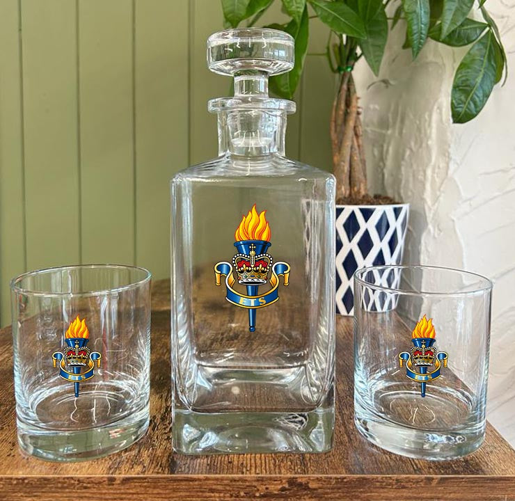 Elevate your night with this 70cl Glass Decanter and Tumbler Set, displaying your proud service background. Crafted from premium glass, this set features a bold square decanter and stopper, along with two corresponding tumblers to elevate your table or sideboard. Perfect for serving your dinner party attendees and co-workers a glass of whiskey, brandy, or cognac.