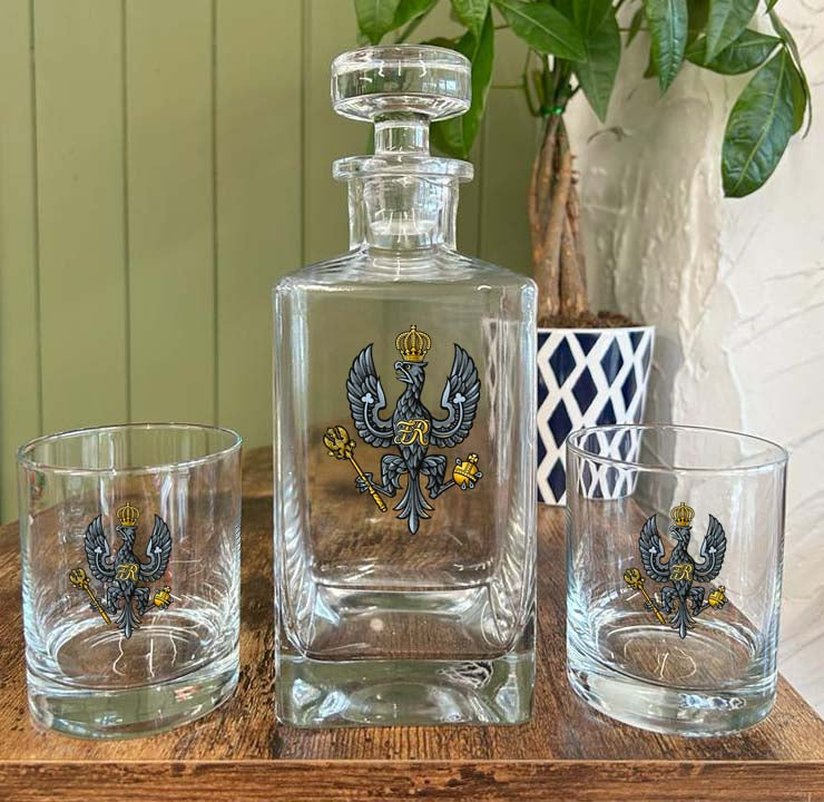 Elevate your night with this 70cl Glass Decanter and Tumbler Set, displaying your proud service background. Crafted from premium glass, this set features a bold square decanter and stopper, along with two corresponding tumblers to elevate your table or sideboard. Perfect for serving your dinner party attendees and co-workers a glass of whiskey, brandy, or cognac.