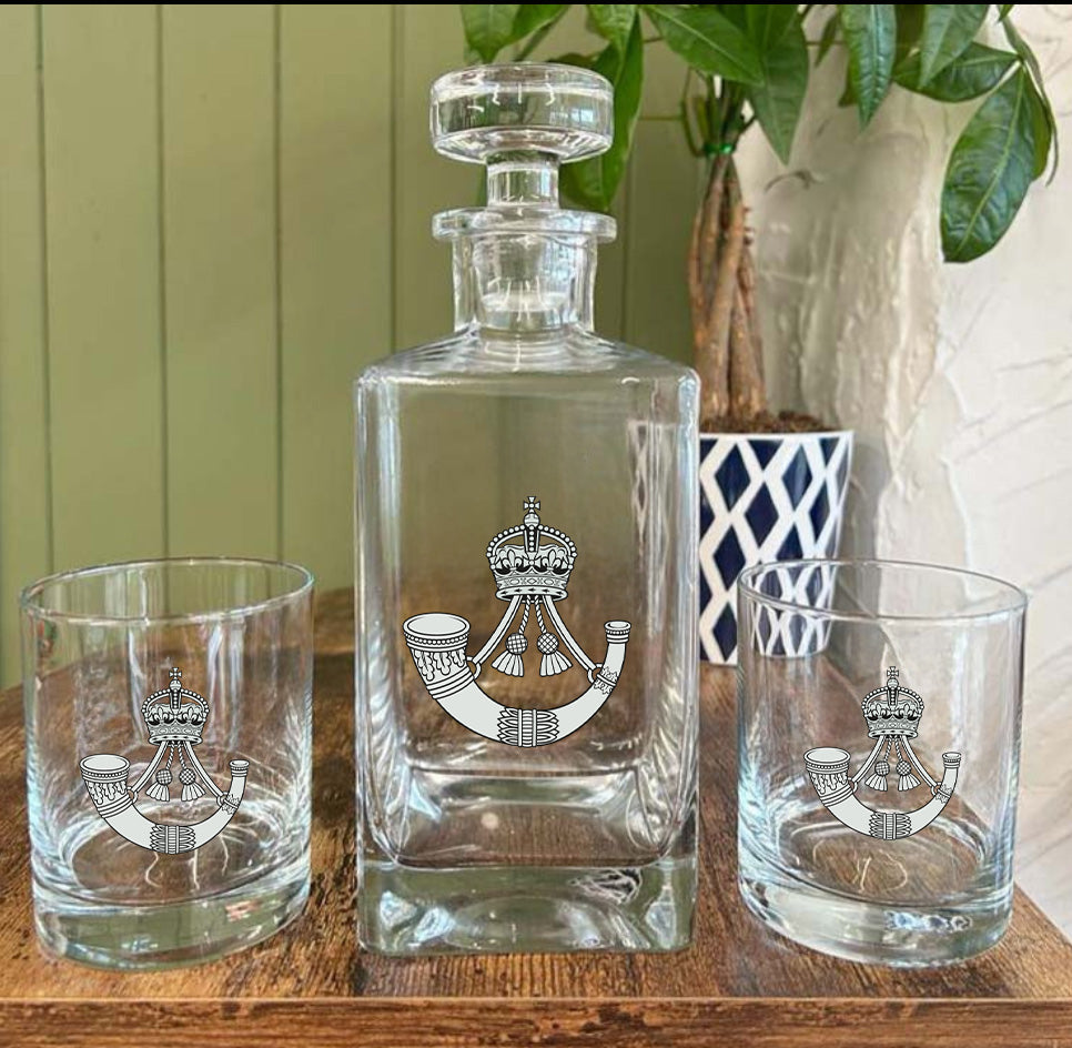 Elevate your night with this 70cl Glass Decanter and Tumbler Set, displaying your proud service background. Crafted from premium glass, this set features a bold square decanter and stopper, along with two corresponding tumblers to elevate your table or sideboard. Perfect for serving your dinner party attendees and co-workers a glass of whiskey, brandy, or cognac.