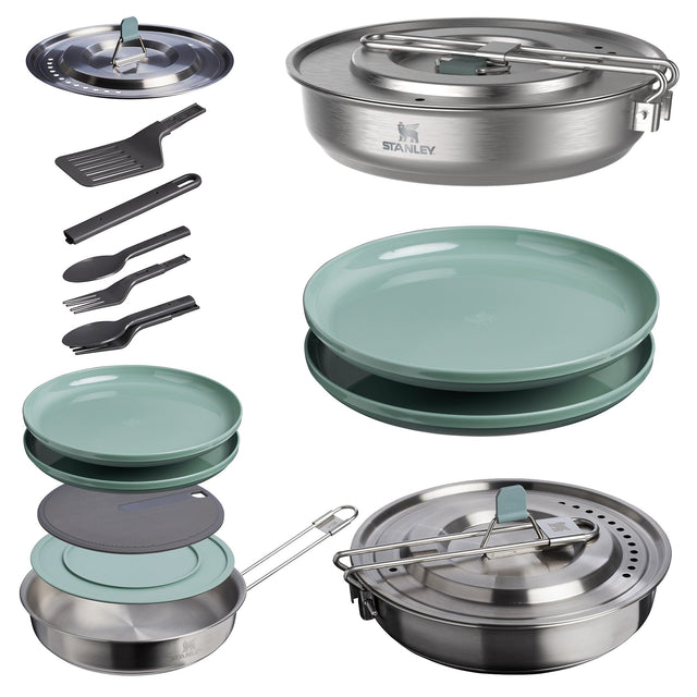 Embrace the simplicity of outdoor cooking with the Stanley Wildfare Core Fry Pan Cookset. This 12-piece set includes everything you need to prepare and enjoy delicious meals in nature. Featuring a 1 qt tri-ply stainless steel fry pan, the set also comes with a lid equipped with vent and strain holes. The fold & lock handle ensures safe and secure cooking. For added convenience, the set includes colorful high-walled plates, a nonslip cutting board, and a removable silicone trivet to protect surfaces.